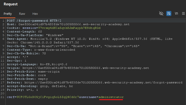 사이트 내 비밀번호 찾기 기능에서 찾으려는 username을 administrator 로 보낼 경우에 HTTP response 200을 반환.