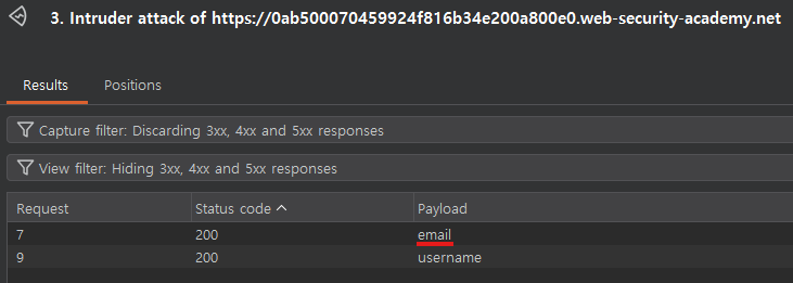 결과 값을 2xx 로 필터링 해주면, username외에 email 파라미터가 존재하는것을 찾을 수 있음