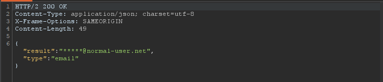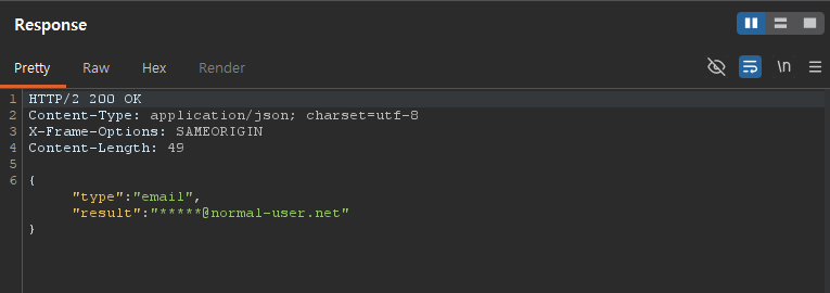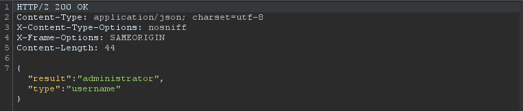 확인을 위해 Repeater에서 field=email과 field=username으로 설정 후에 전송 하게되면, 아래와 같이 성공적으로 email과 username을 반환 하는걸 확인.