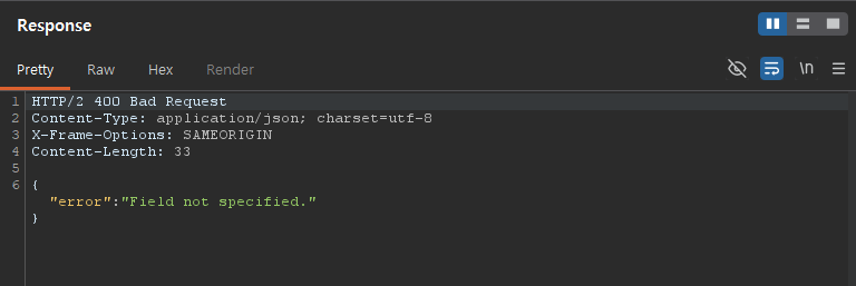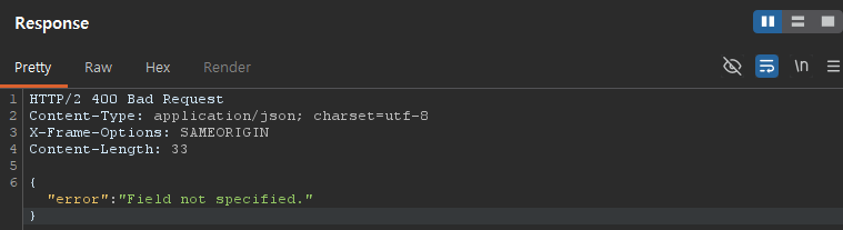 “Field not specified” 라는걸 확인할 수 있음. 이는, 서버측에서 추가로 field라는 파라미터를 사용하고 있으며, Request에 #을 추가함으로써 해당 파라미터가 요청에서 제거됐다고 추측가능함.