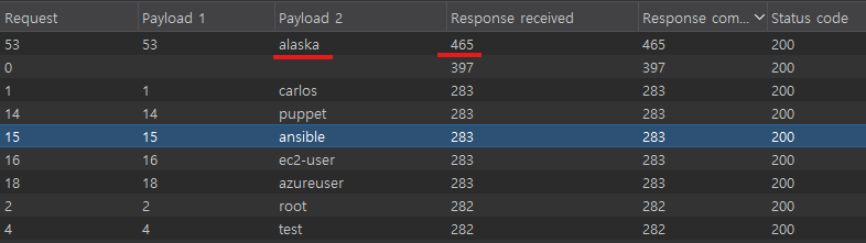 결과로 보면 이 alaska라는 username이 유효한 계정이라고 추론 할 수 있다.