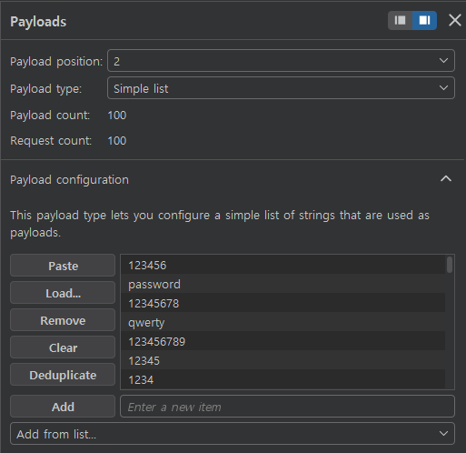 이제 username을 방금 찾은 값으로 고정한후에 비밀번호 brute force를 진행한다.