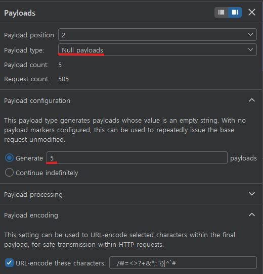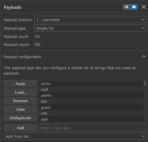 이렇게 설정하면 두 번째 payload를 이용해 동일한 username 요청을 여러 번 반복할 수 있다.