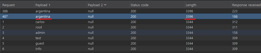 하지만 특정 username에 대해서는 응답 길이가 더 긴 것을 확인할 수 있다.
