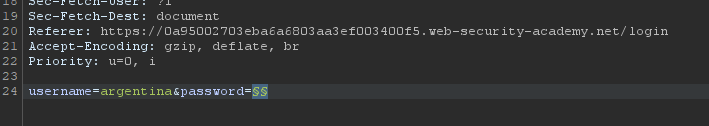 username에는 앞 단계에서 확인한 argentina를 고정하고, password 파라미터에 payload position을 추가한다.
