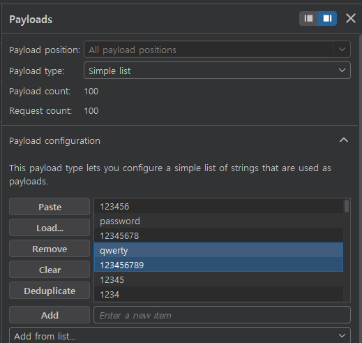 이후 PortSwigger에서 제공한 password wordlist를 payload로 설정한 뒤 공격을 실행한다.