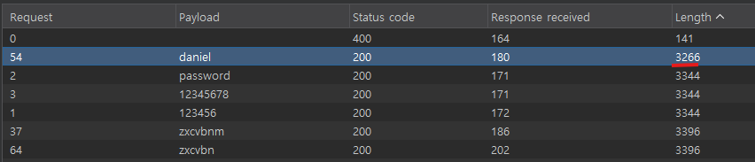 공격 결과를 확인해보면 대부분의 응답은 동일한 Length를 반환하지만, daniel을 사용한 요청에서 응답 Length가 다른 것을 확인할 수 있다. 이는 해당 요청에서 로그인이 정상적으로 처리되었을 가능성이 높다는 의미이며, 따라서 daniel이 올바른 password라는 것을 유추할 수 있다.