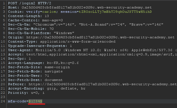 하지만 이 lab에서는 MFA 코드 입력 단계에서 시도 횟수 제한이 없으며 brute-force 공격이 가능하다.