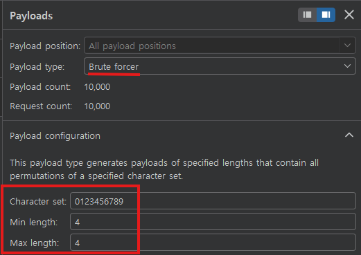 Intruder에서 mfa-code 파라미터에 payload position을 설정한다.