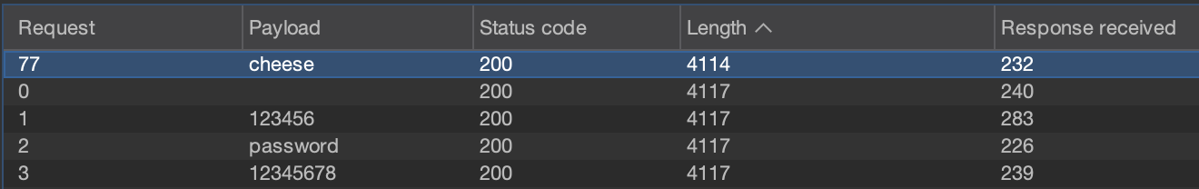 Sniper 공격 결과 하나의 요청만 Response Length가 다른 것을 확인할 수 있다.
