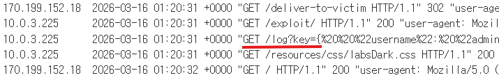 그러면 응답 데이터가 URL query string에 붙고, exploit server access log에 그대로 남는다.