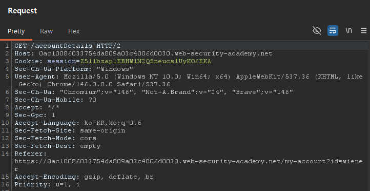 Burp의 HTTP history를 확인하면 GET /accountDetails 요청을 확인할 수 있다.