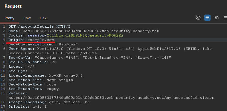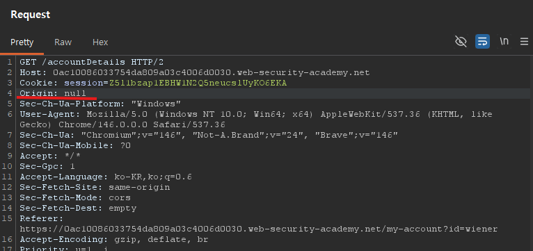 이 lab은 Origin: null을 신뢰하는 CORS 설정이 핵심이다.