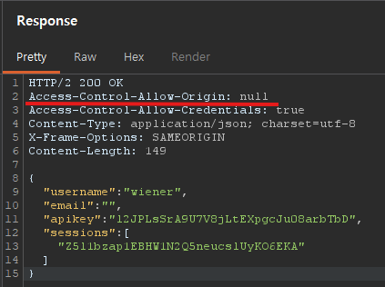 이 lab의 취약점은 Access-Control-Allow-Origin: null 설정이다.