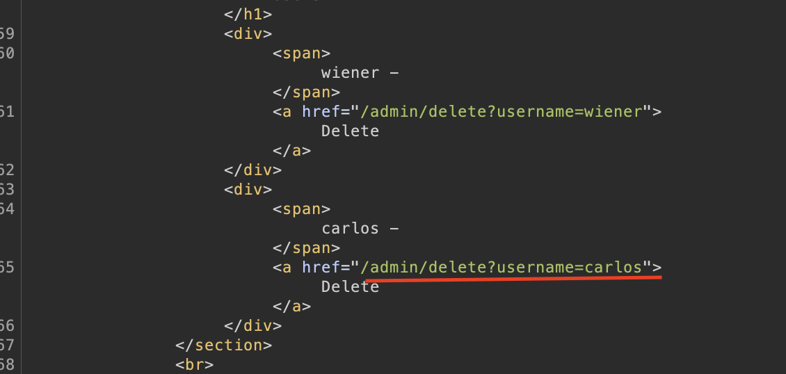 admin panel에 엑세스가 되고 carlos계정을 삭제하는 링크가 나타난다.