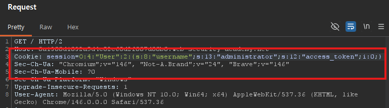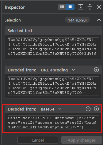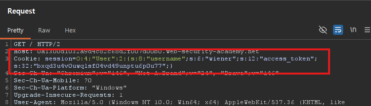 O:4:"User":2:{s:8:"username";s:6:"wiener";s:12:"access_token";s:32:"..."}