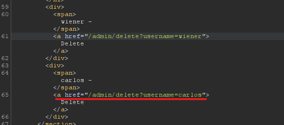 administrator 계정으로 인증이 우회되며 carlos계정을 삭제할 수 있는 링크가 생긴다.