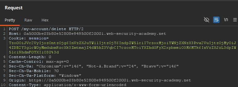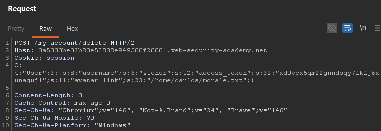 내 계정 (wiener)이 삭제됨과 동시에 /home/carlos/morale.txt파일도 함께 삭제된다.