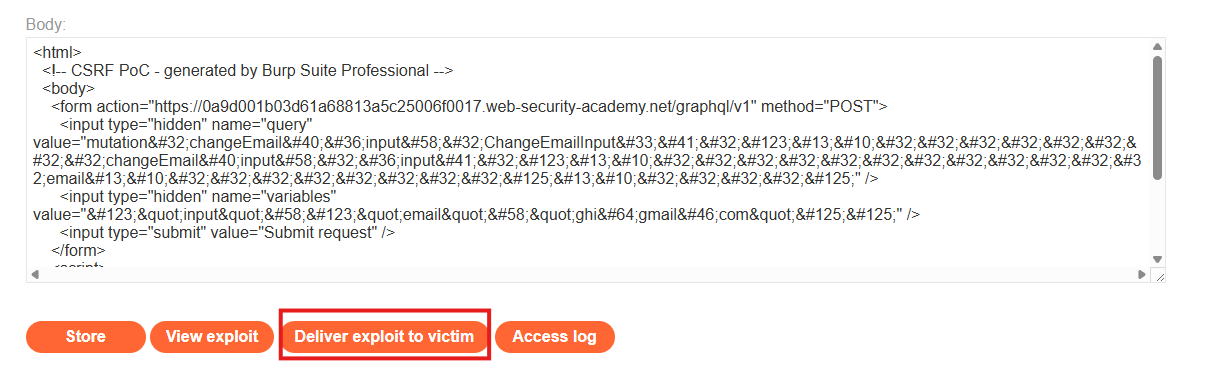 Burp Suite의 CSRF PoC Generator를 통해 생성한 HTML 코드를 Exploit Server의 Body에 업로드한다.