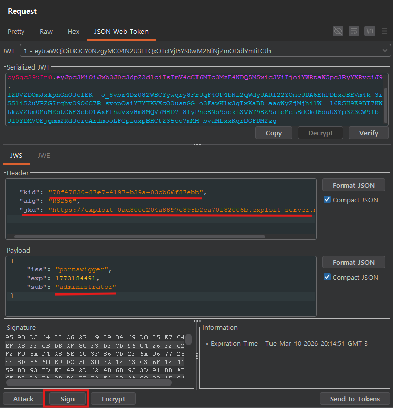 exploit server는 공격자가 만든 JWK Set을 제공하는 서벼 역할을 하게 된다.