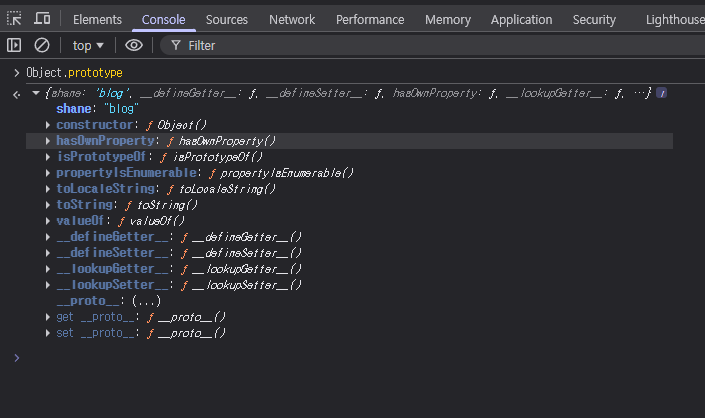 위 코드들은 Object.prototype.shane = "blog와 같은 코드들이다.