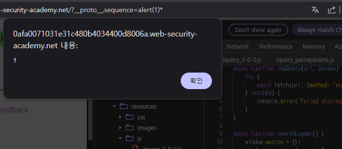 우선 sequence=alert(1)으로 프로토타입을 오염시켜주고 디버거를 다시 진행한다.