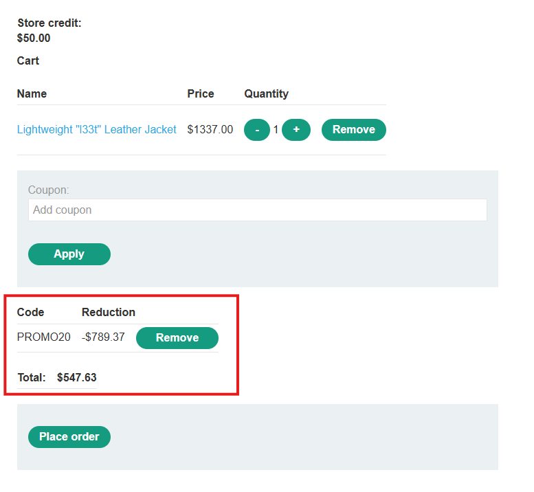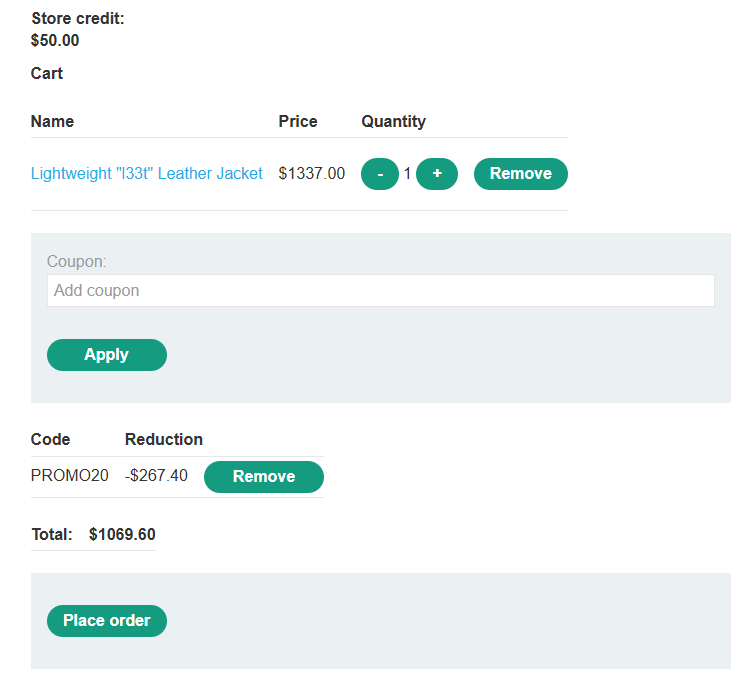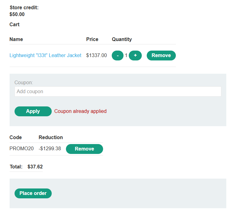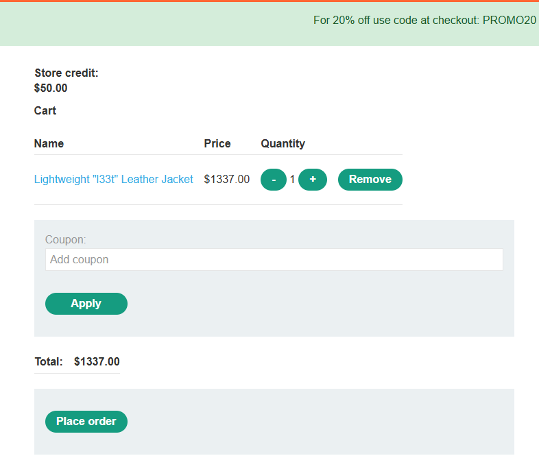 이 취약점을 이용해서 Lightweight “l33t” Leather Jacket을 보유한 돈 보다 더 싸게 구매 하는게 목표다.