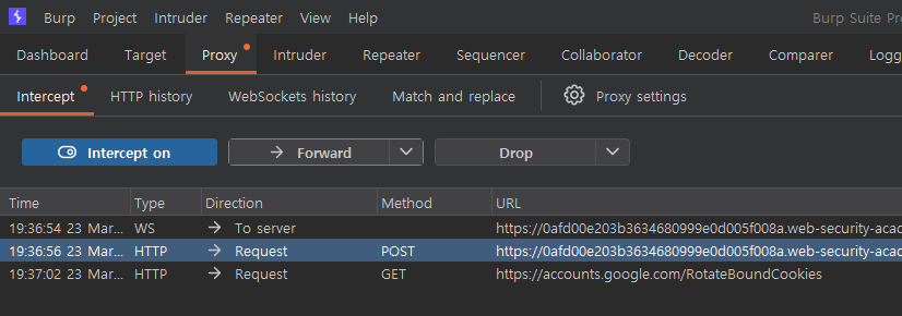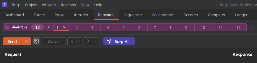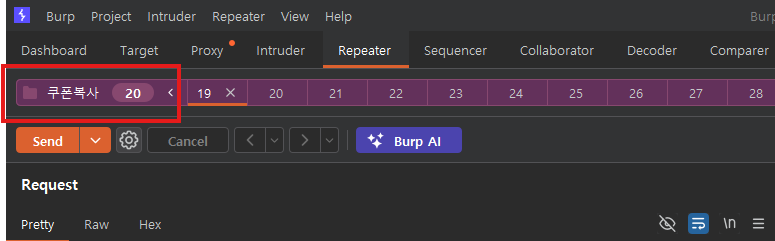 더 많은 요청을 보내기 위해 다시 Proxy를 켜주고 Repeater 탭을 스무 개로 늘려준다.