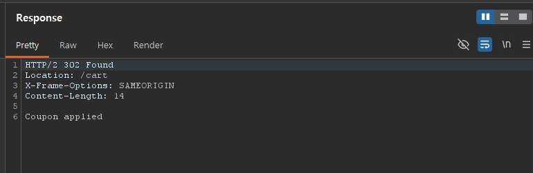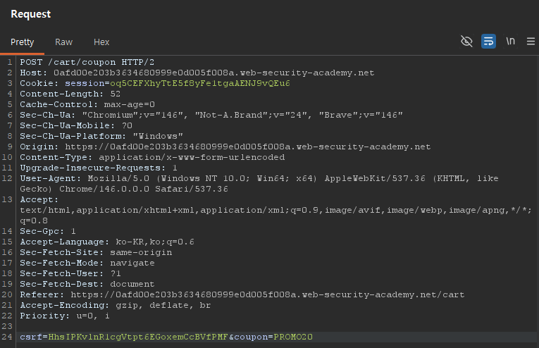 우선은 Burp Proxy Intercept를 켜주고 쿠폰을 적용시켜준다.