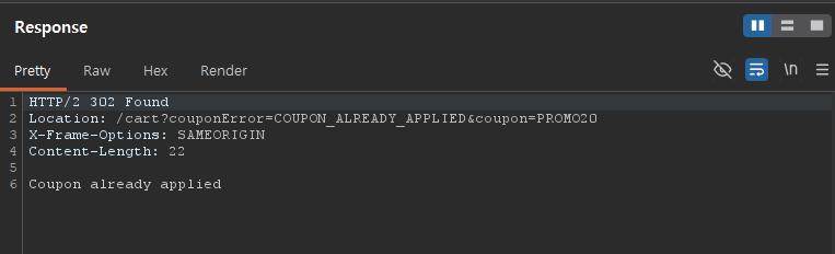 캡처한 POST /cart/coupon 요청을 Repeater로 전송해서 여러 개 복사한 뒤 Group 으로 묶어준다. 여러 요청을 거의 동시에 서버에 도달하도록 만들어주기 위해 Send group in parallel (single-packet attack)을 선택 해준다.